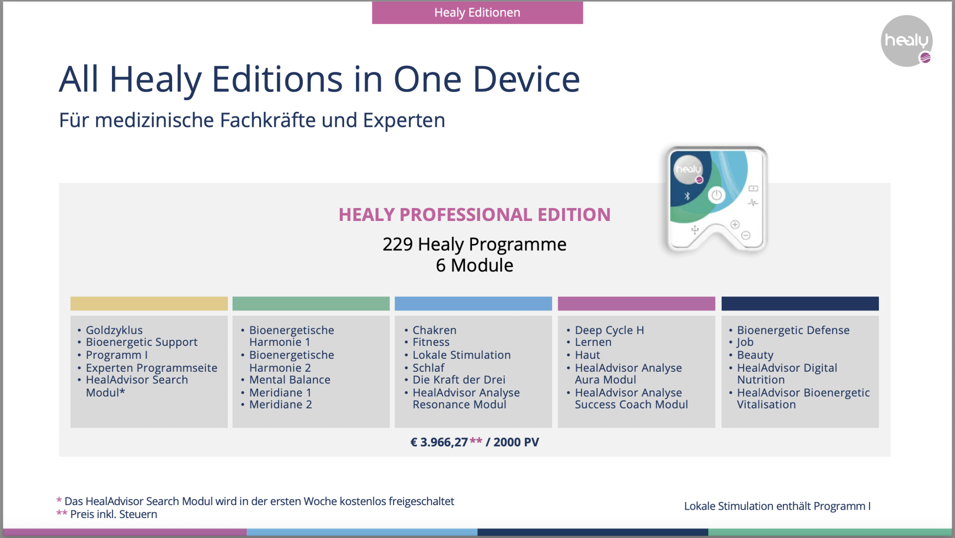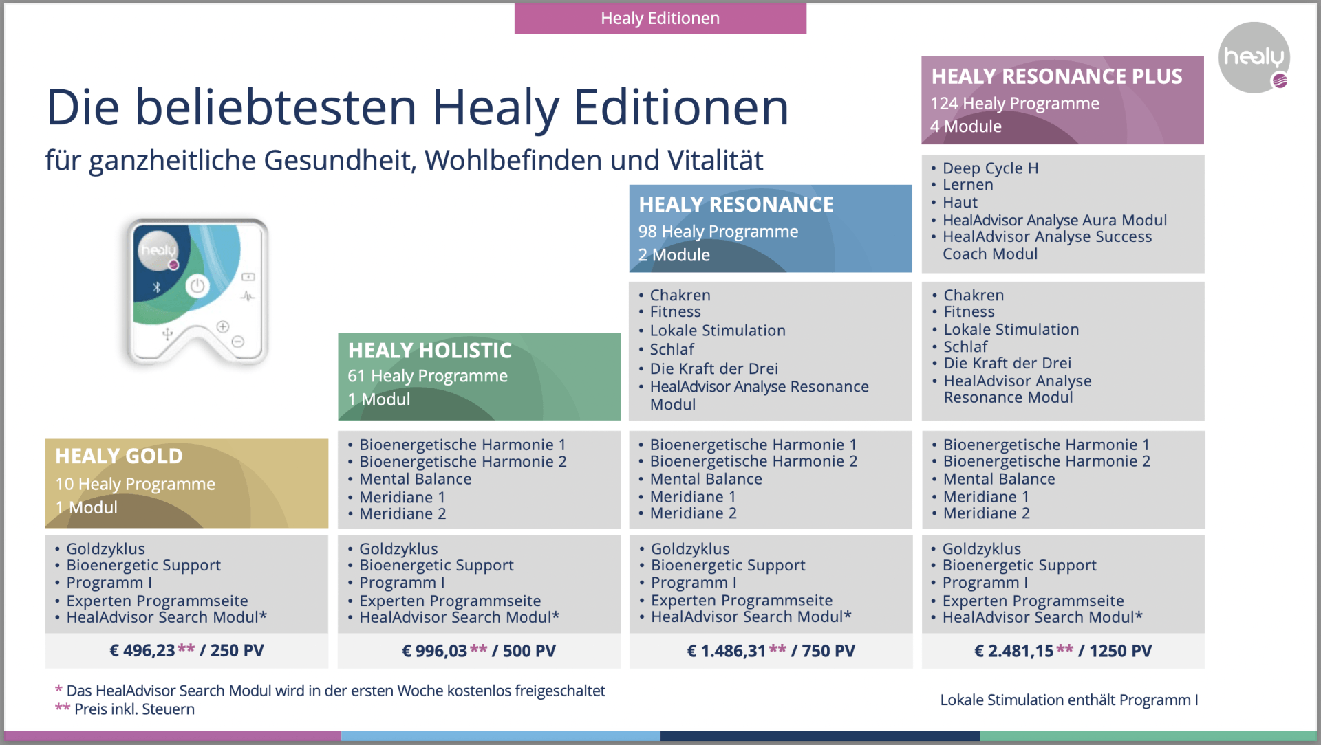 Die Wissenschaft erkennt die Existenz des Informationsfeldes, die Analyse und Harmonisierung damit und seine sonstige Bedeutung nicht an, da keine wissenschaftliche Evidenz vorhanden ist. Die Individualisierten Mikrostrom Frequenz (IMF) Programme des Healy, die Quanten-Potenzial-Frequenzen (QPF) der Healy Coil und die Magnetfeld-Programme von MagHealy werden von der Schulmedizin nicht anerkannt, da wissenschaftliche Evidenz im Sinne der Schulmedizin fehlt. Die Informationen auf diesen Seiten dienen nur zu Referenz- und Bildungszwecken. Healy World bemüht sich zwar, die Informationen auf diesen Seiten auf dem neuesten Stand zu halten, übernimmt jedoch keine Garantie oder Gewährleistung für die Richtigkeit, Eignung oder Aktualität der Informationen. Healy World haftet nicht für Verluste oder Schäden, die aus der Nutzung der auf diesen Seiten bereitgestellten Informationen entstehen. Alle Informationen werden auf einer "Ist-Basis" präsentiert und die Verantwortung für ihre Auslegung und Nutzung liegt allein beim Nutzer. Die Nutzung von Healy World Produkten, Programmen oder Informationen erfolgt auf eigenes Risiko und unterliegt dem Ermessen und dem unabhängigen Urteil des Nutzers. Die Healy World Unternehmen lehnen ausdrücklich die Verantwortung für Entscheidungen des Nutzers im Zusammenhang mit der Nutzung von Healy World Produkten oder Dienstleistungen ab, die über den Rahmen der Bedienungsanleitung und des vom Unternehmen zur Verfügung gestellten Handbuchs hinausgehen.