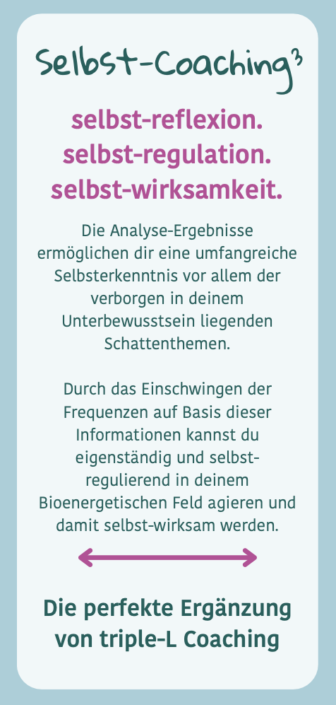 triple-L Coaching ist wie eine ganzheitliche Betriebsanleitung für unser Leben, eine Anleitung zum Selbst-Coaching mit dem Ziel, unser Leben voller Inspiration, Begeisterung und Wohlbefinden nach unseren Vorstellungen zu gestalten.